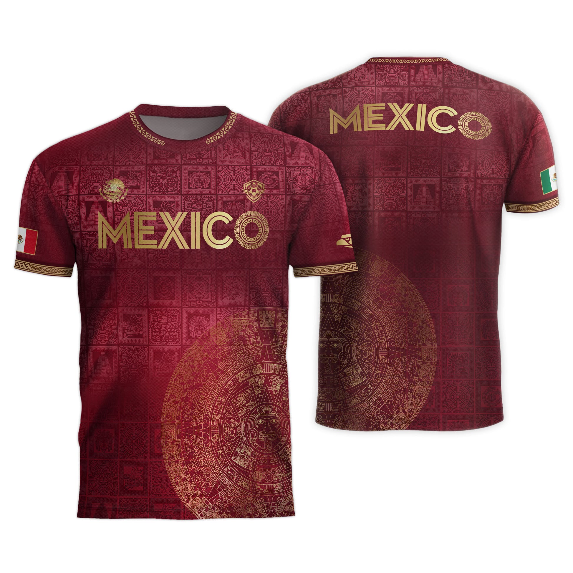 Bold and majestic — this red and gold soccer jersey embodies the spirit of Mexico through timeless Aztec artistry.