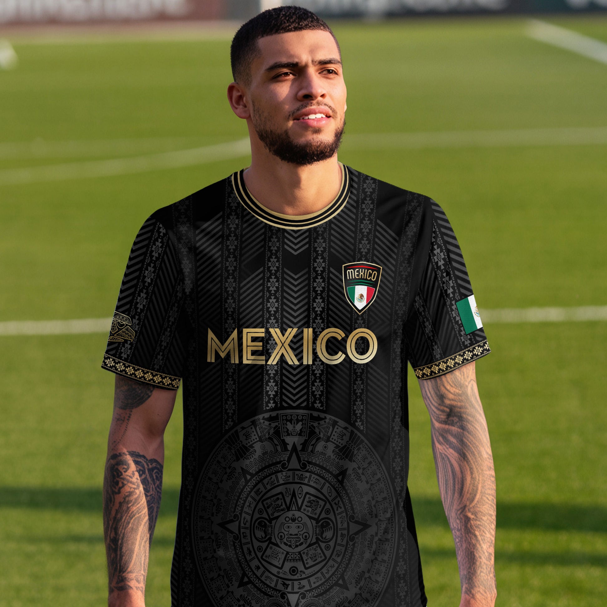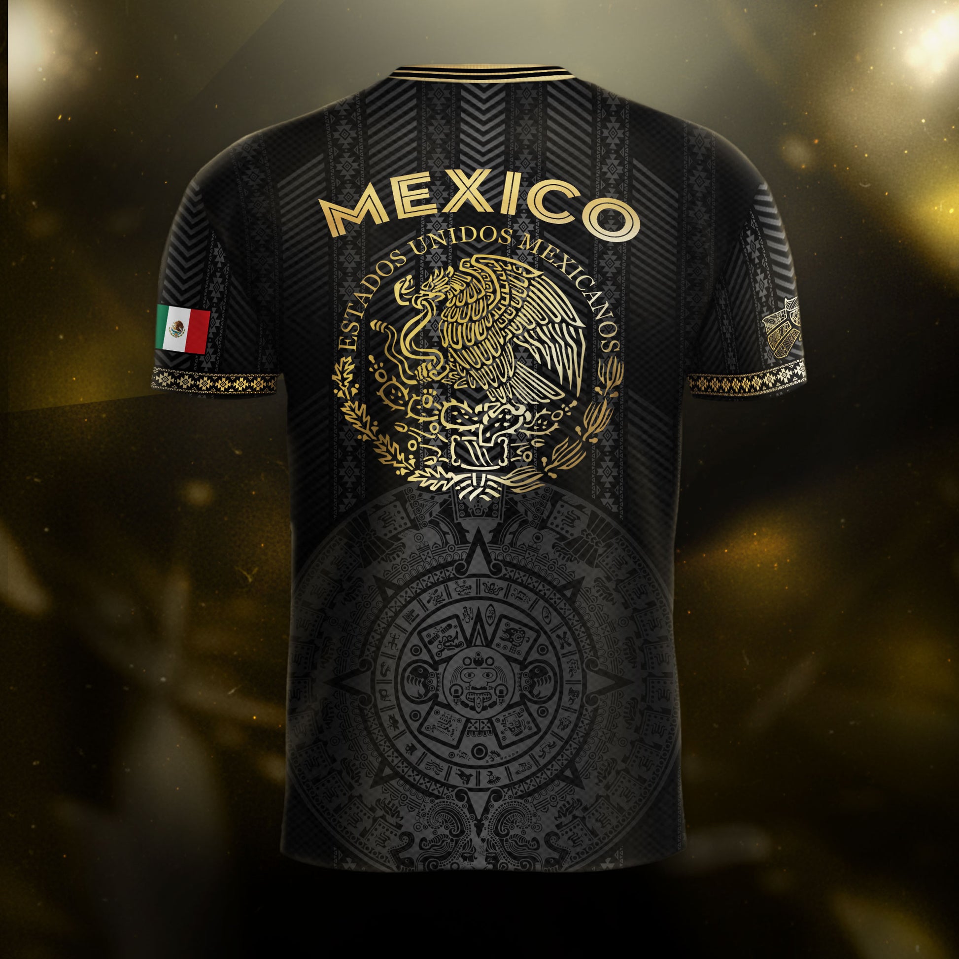 Premium Mexico soccer jersey showcasing golden details, Aztec-inspired calendar print, and national identity symbols on front and back.