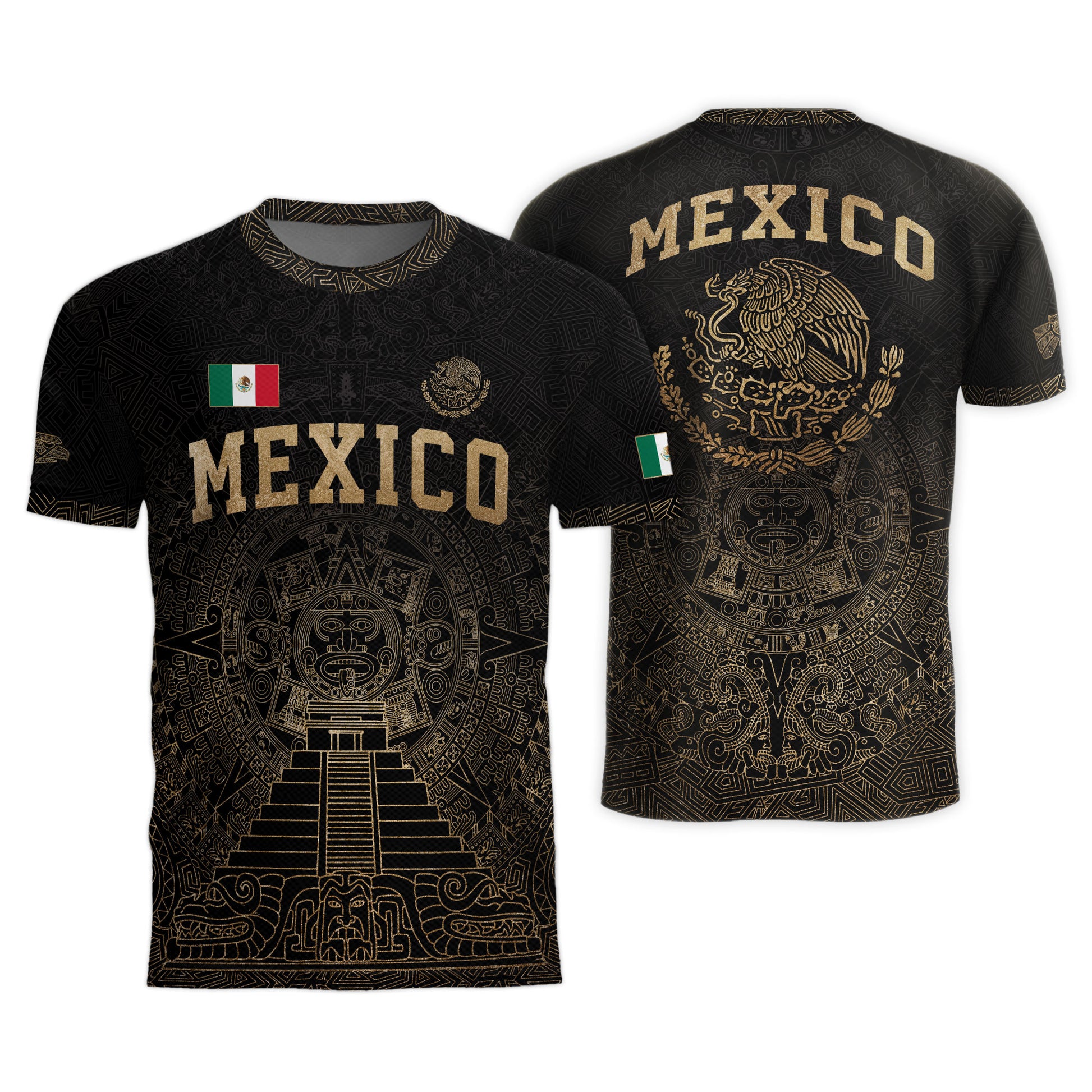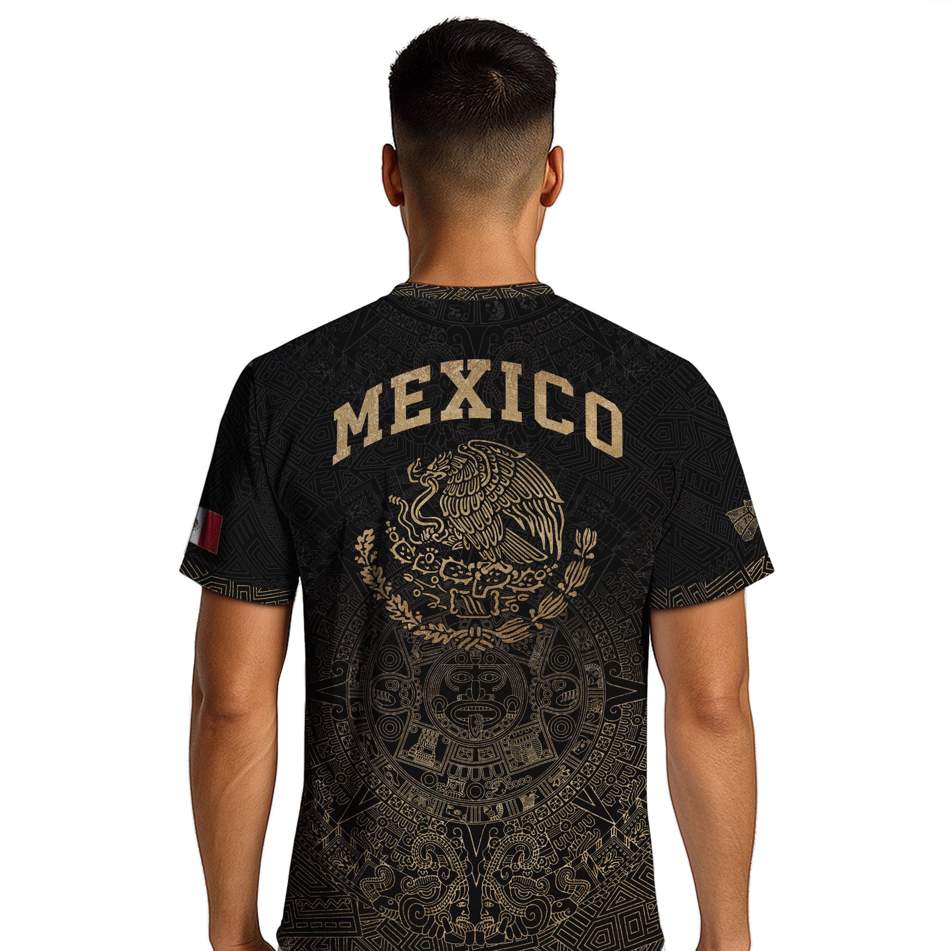 Mexico soccer jersey in black with gold Aztec calendar and eagle emblem. Lightweight, breathable fabric inspired by national heritage.