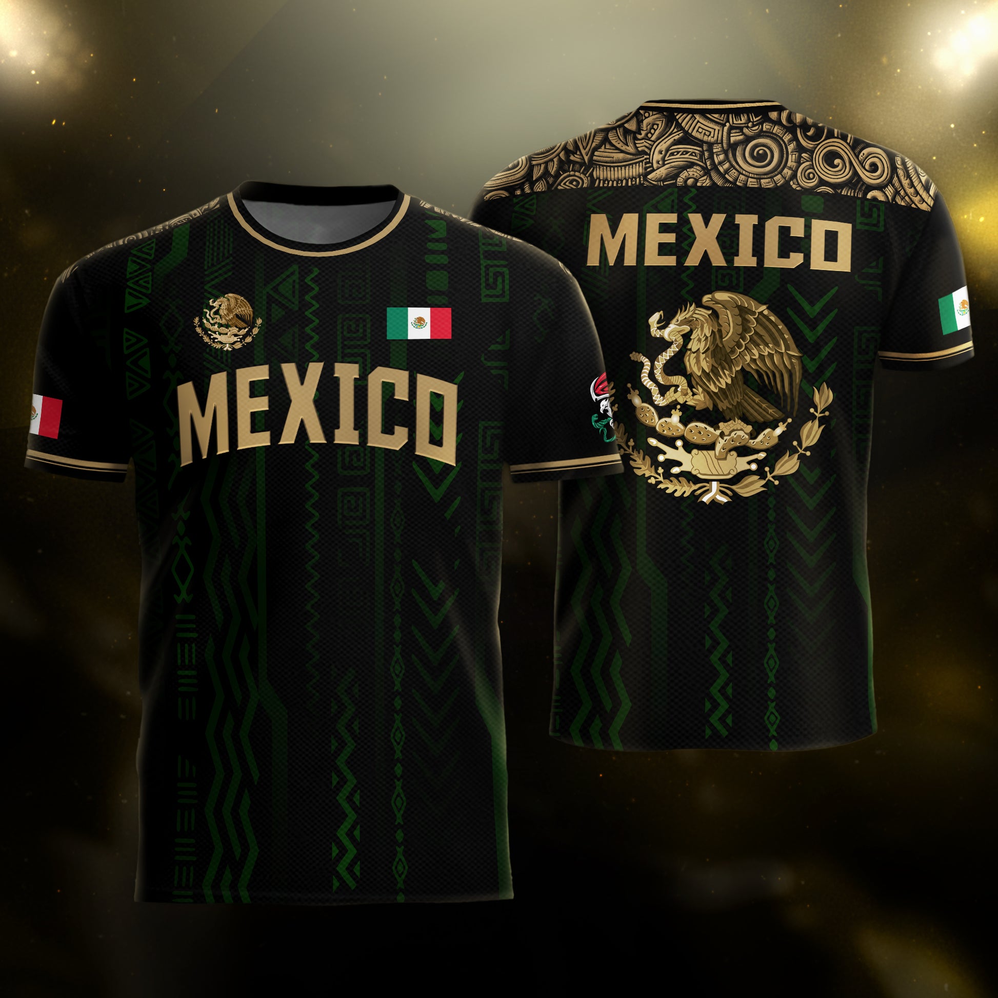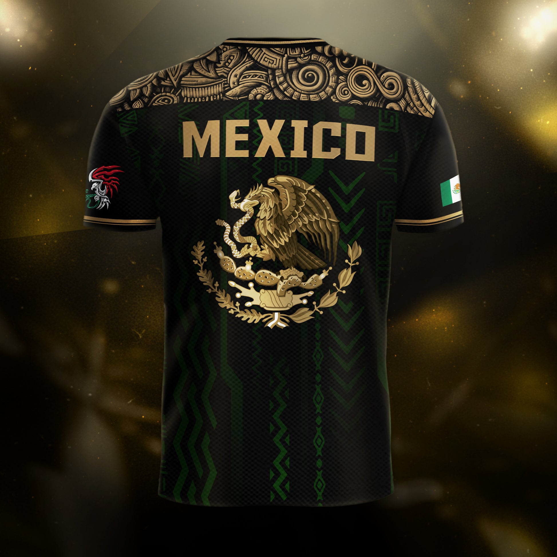 Stylish black and gold Mexico jersey showcasing bold MEXICO print, iconic crest, flag patch, and unique Aztec design elements rooted in tradition.