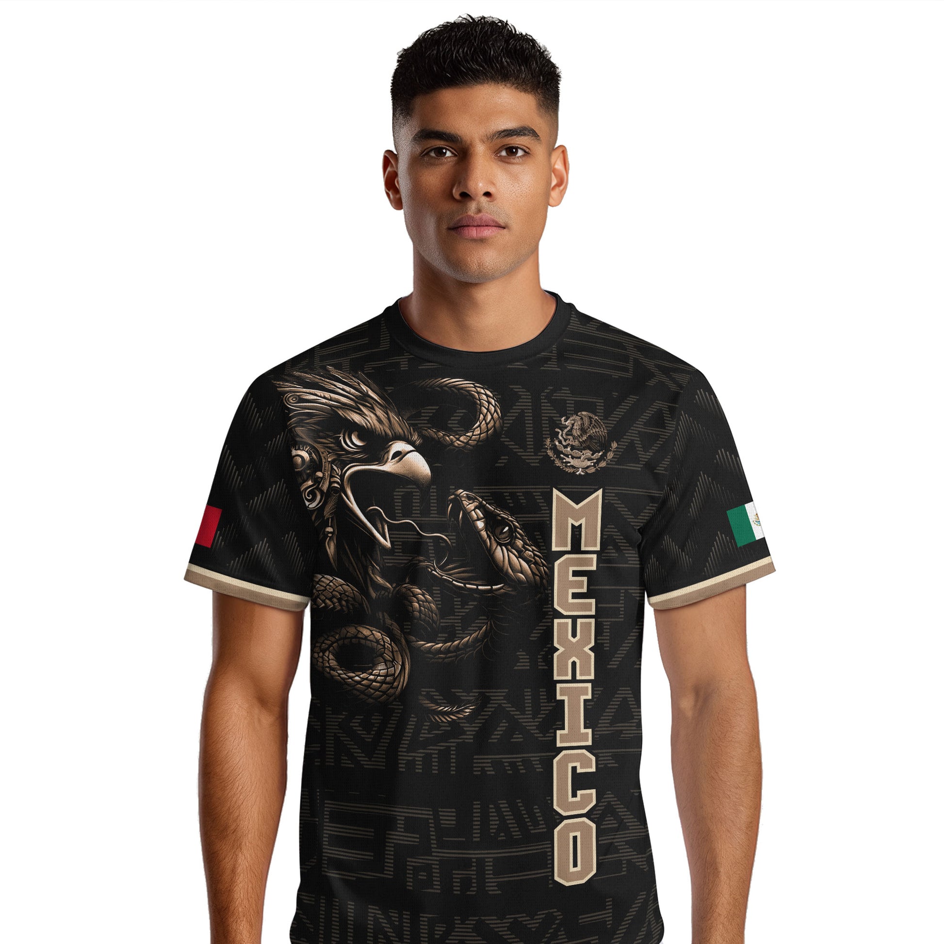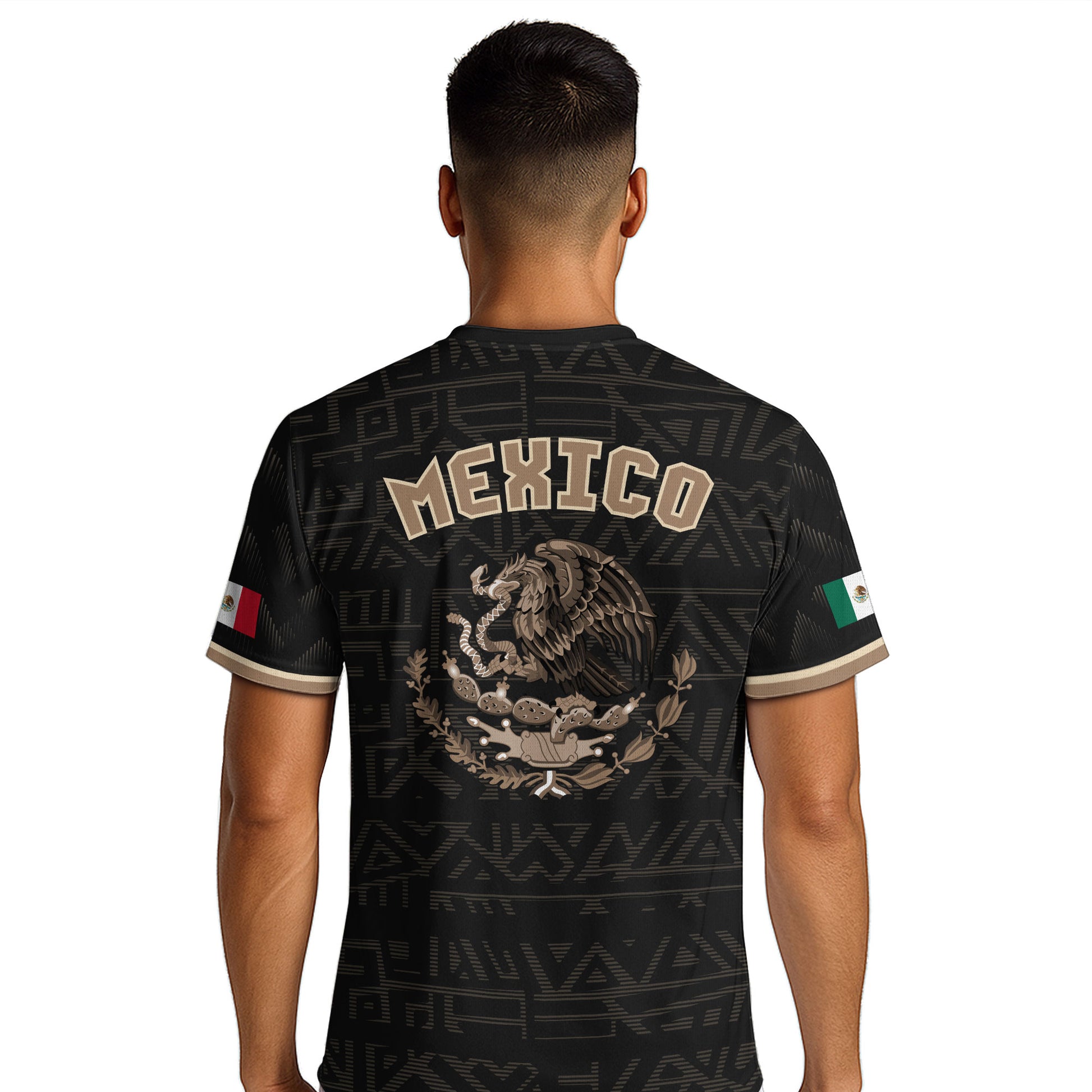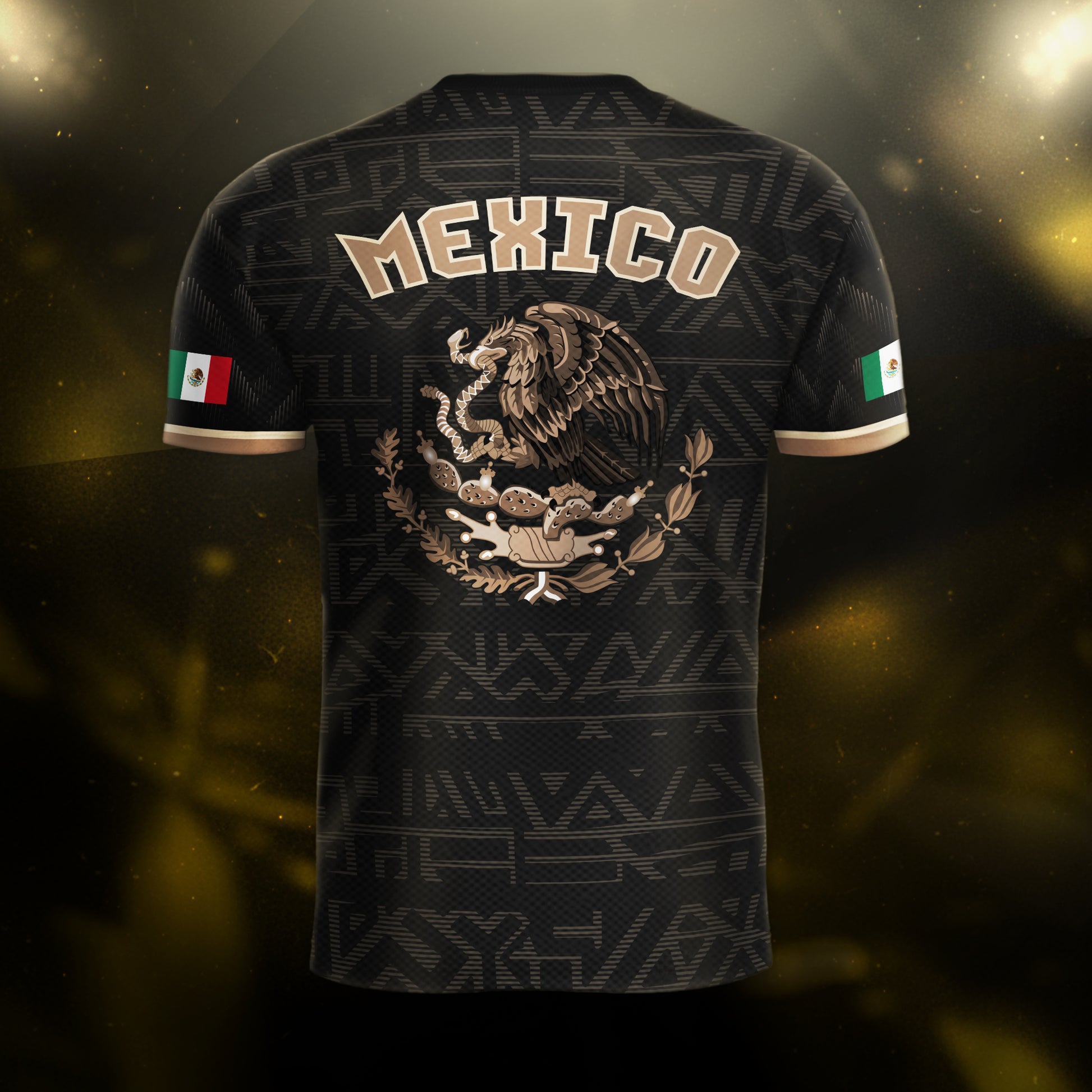 Mexico soccer jersey in black with gold details, featuring eagle and serpent artwork, cultural Aztec-inspired motifs, and heritage elements.