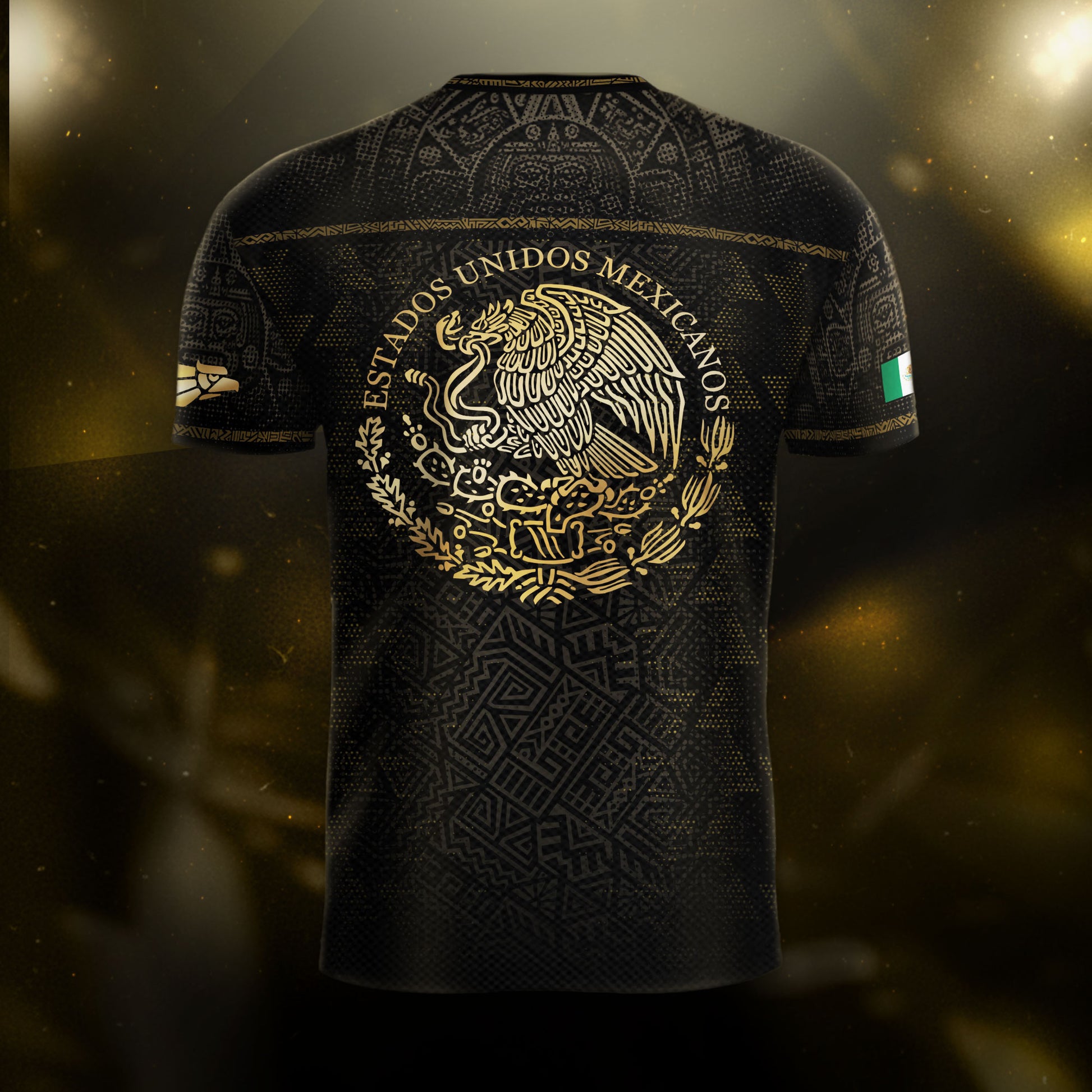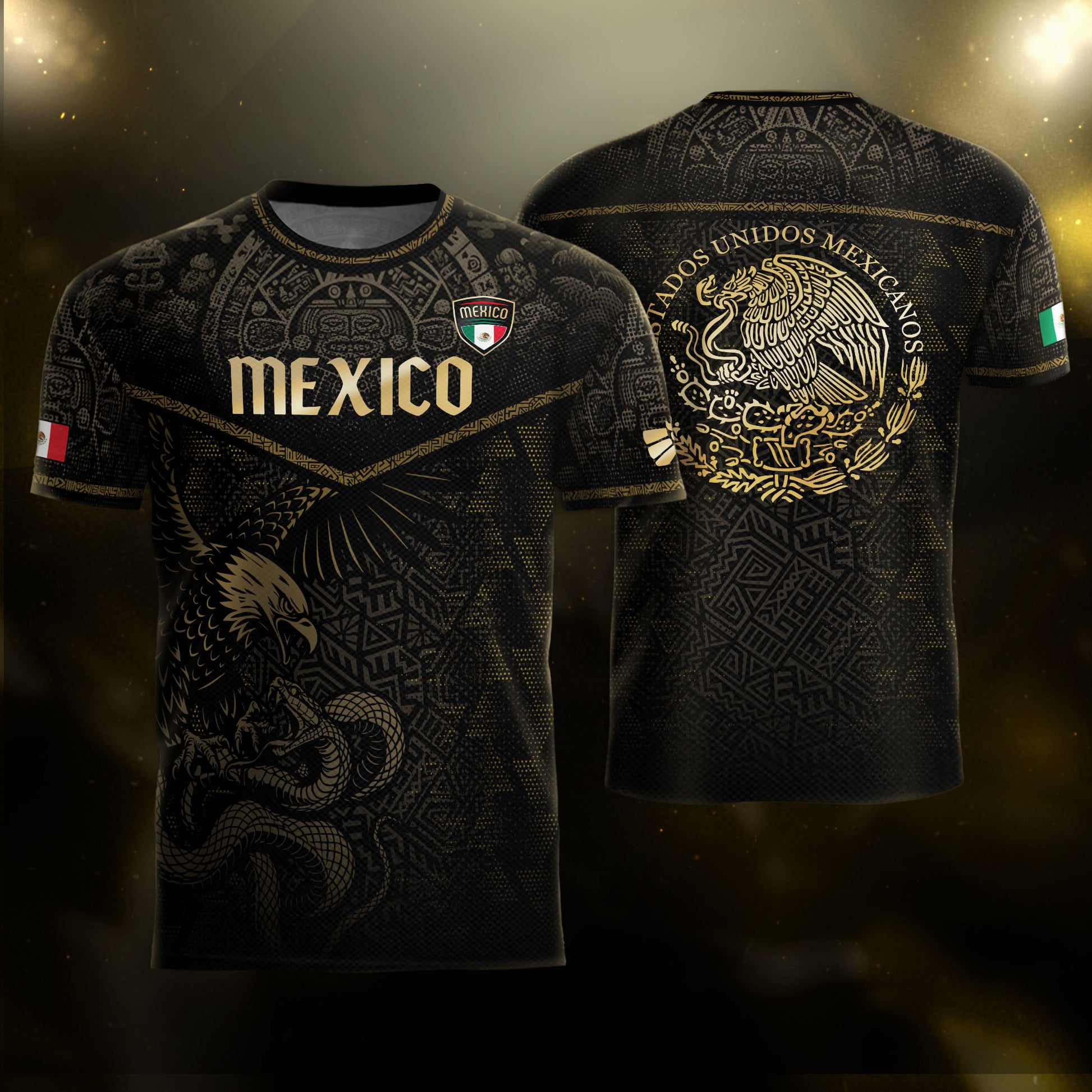 Adult Mexico soccer jersey in black and gold with Aztec eagle and snake design. Celebrate Mexican heritage and football pride in premium style.