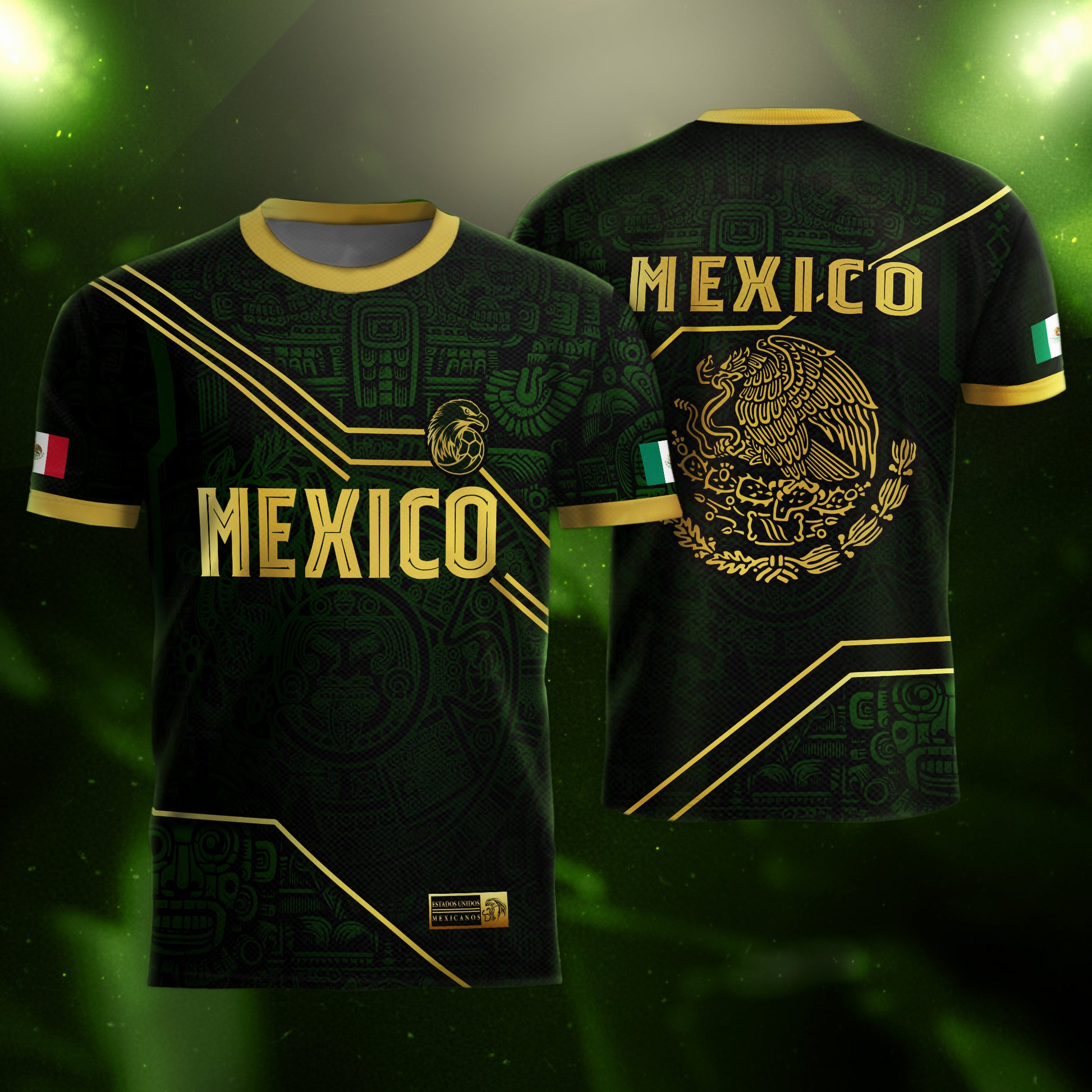 Mexico Soccer Jersey in black green gold Aztec heritage design. Stylish athletic fit with detailed patterns and Mexican national emblem.