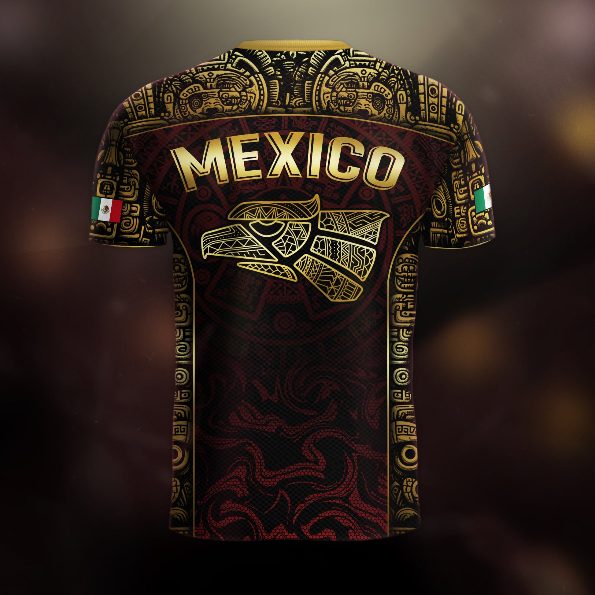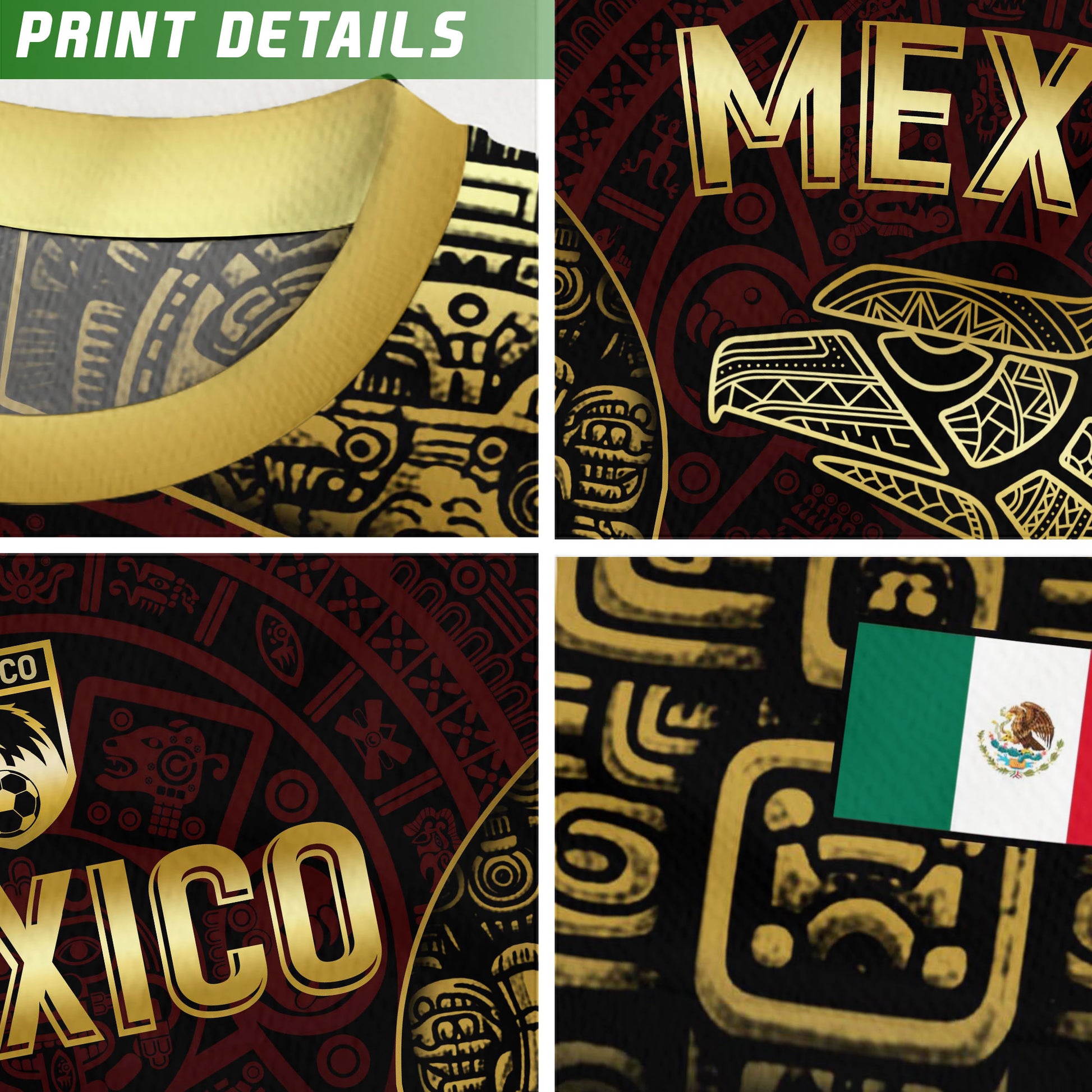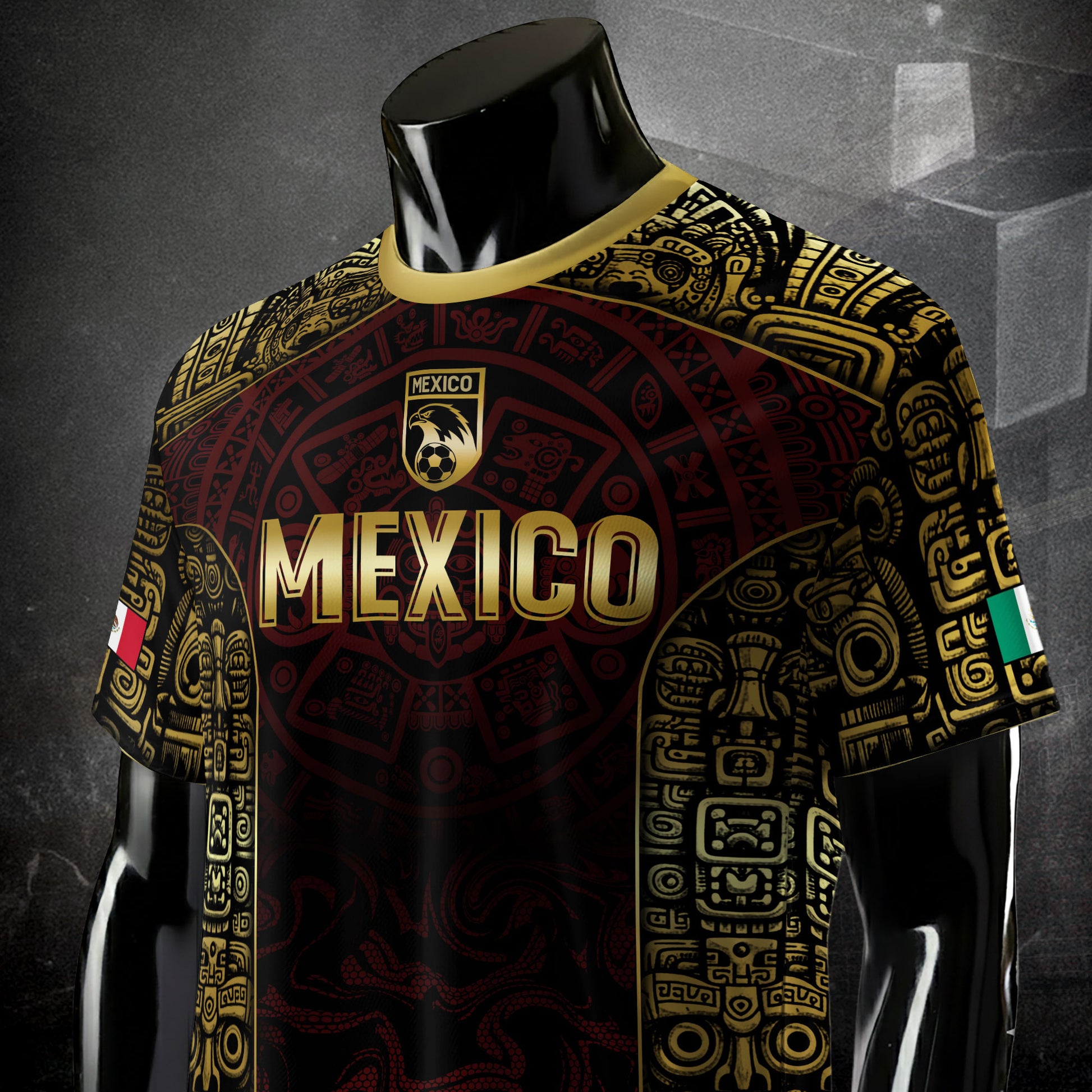 Mexico Soccer Jersey in black red gold with Aztec calendar design. Premium look with detailed cultural patterns and modern athletic fit.