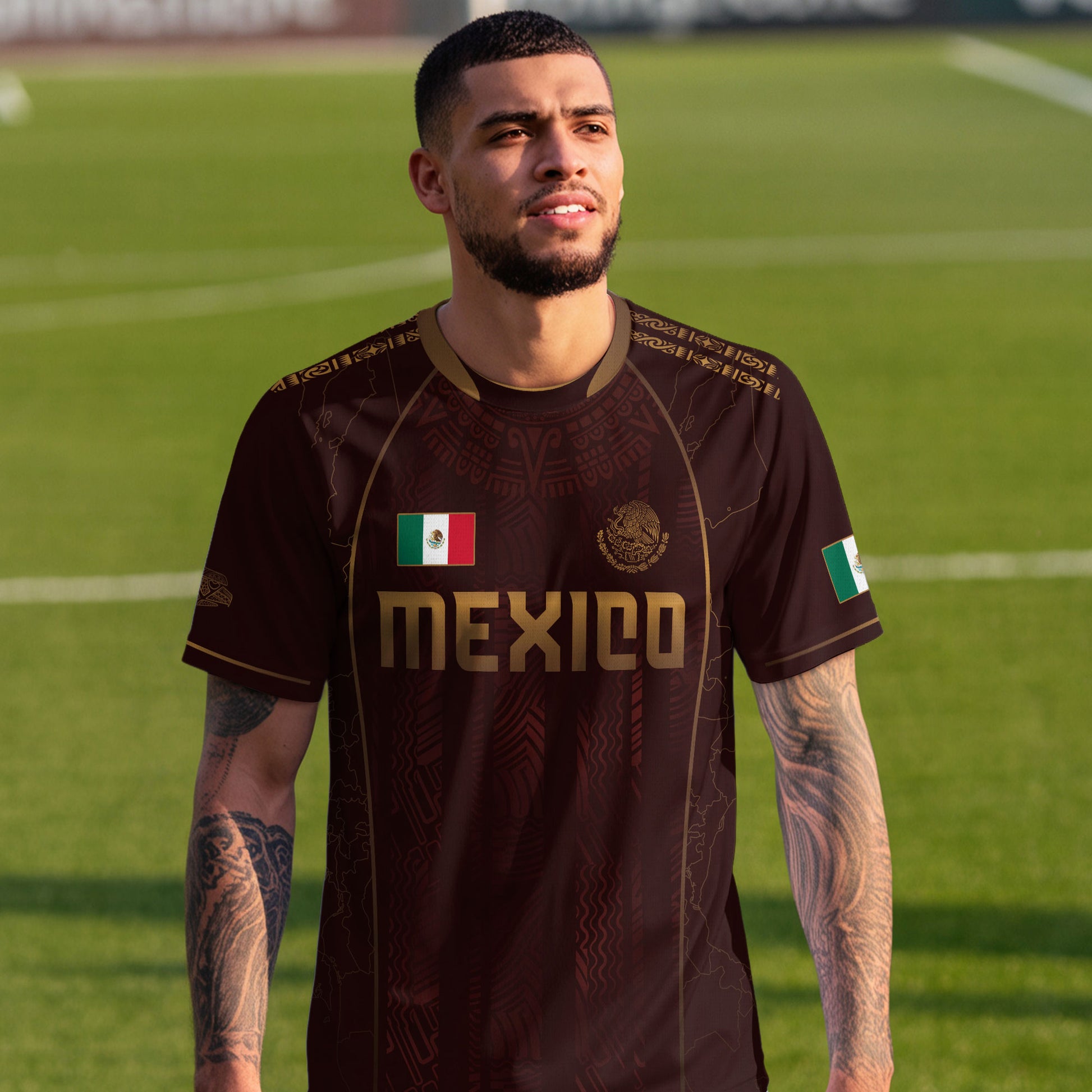Mexico soccer jersey in burgundy with gold Aztec eagle and heritage symbols. Soft, breathable fabric for comfort and pride.