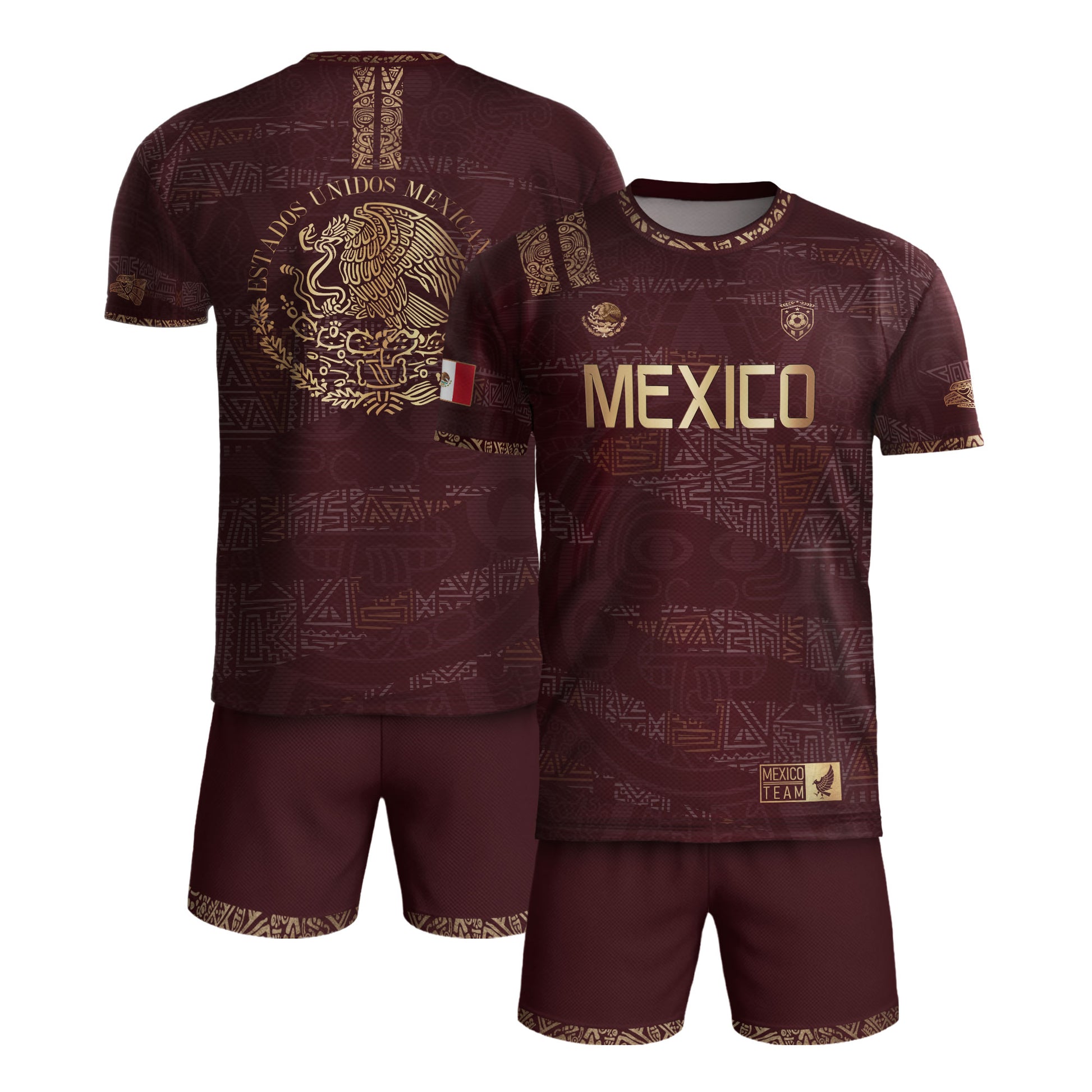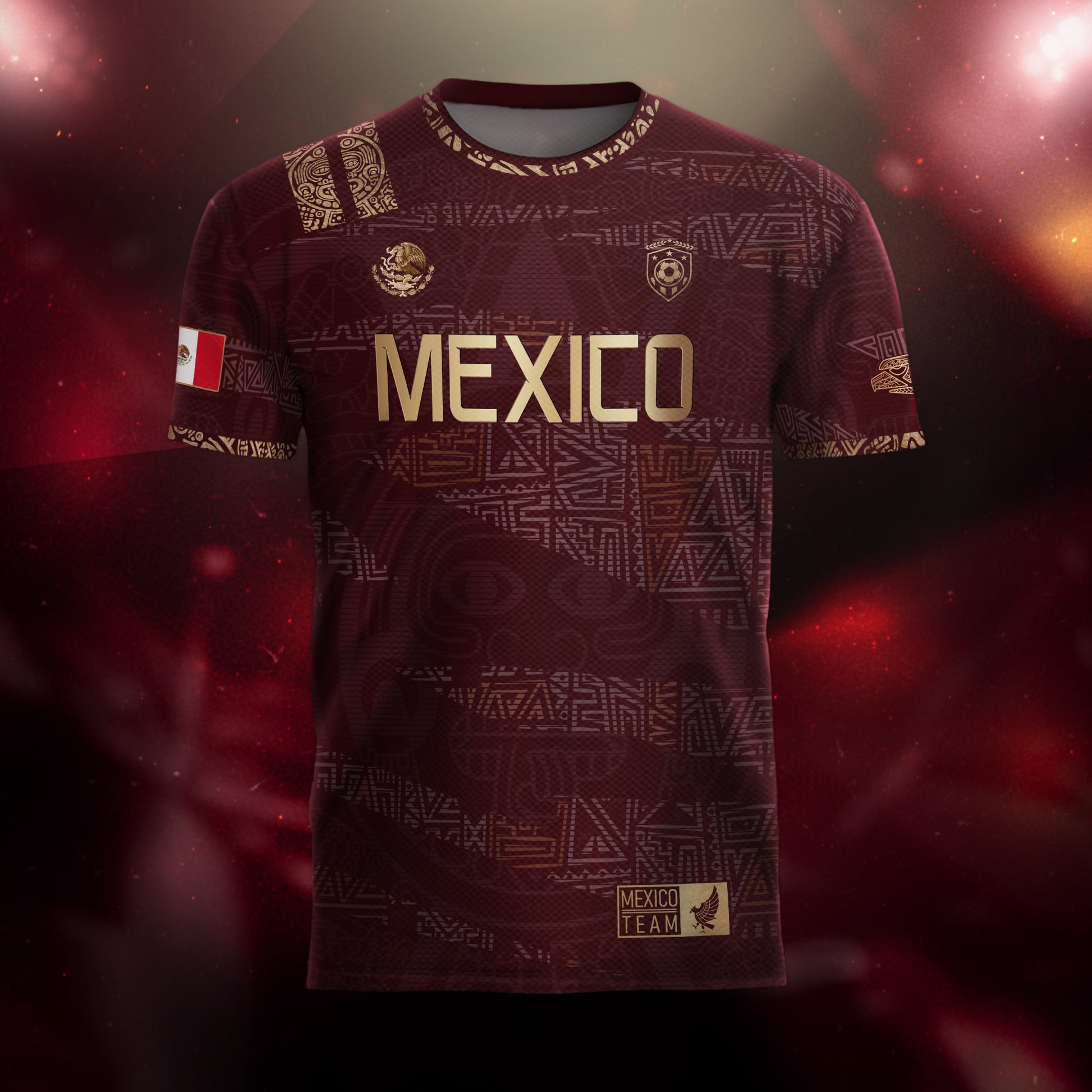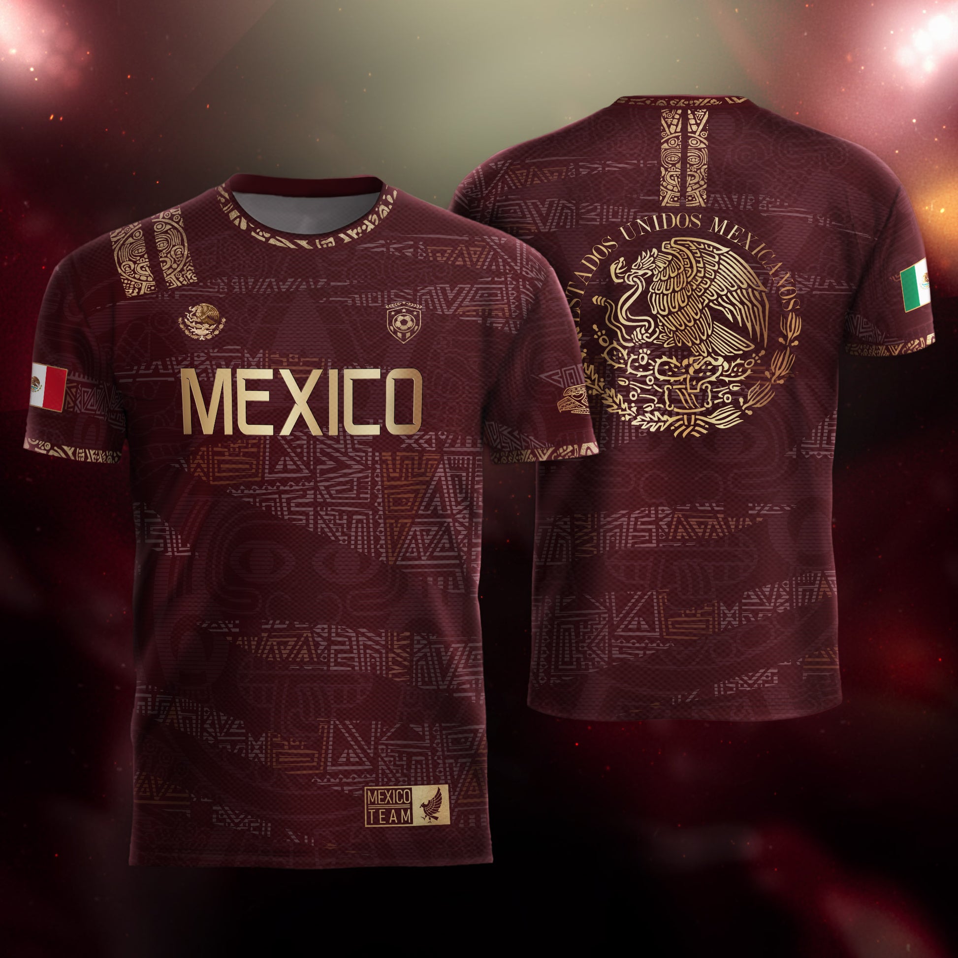 Bold burgundy Mexico soccer jersey with golden Aztec patterns and eagle crest. A striking design blending tradition and modern football style.