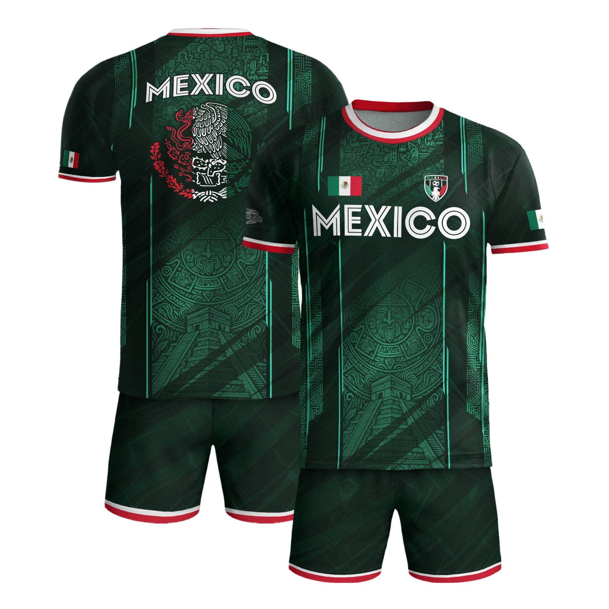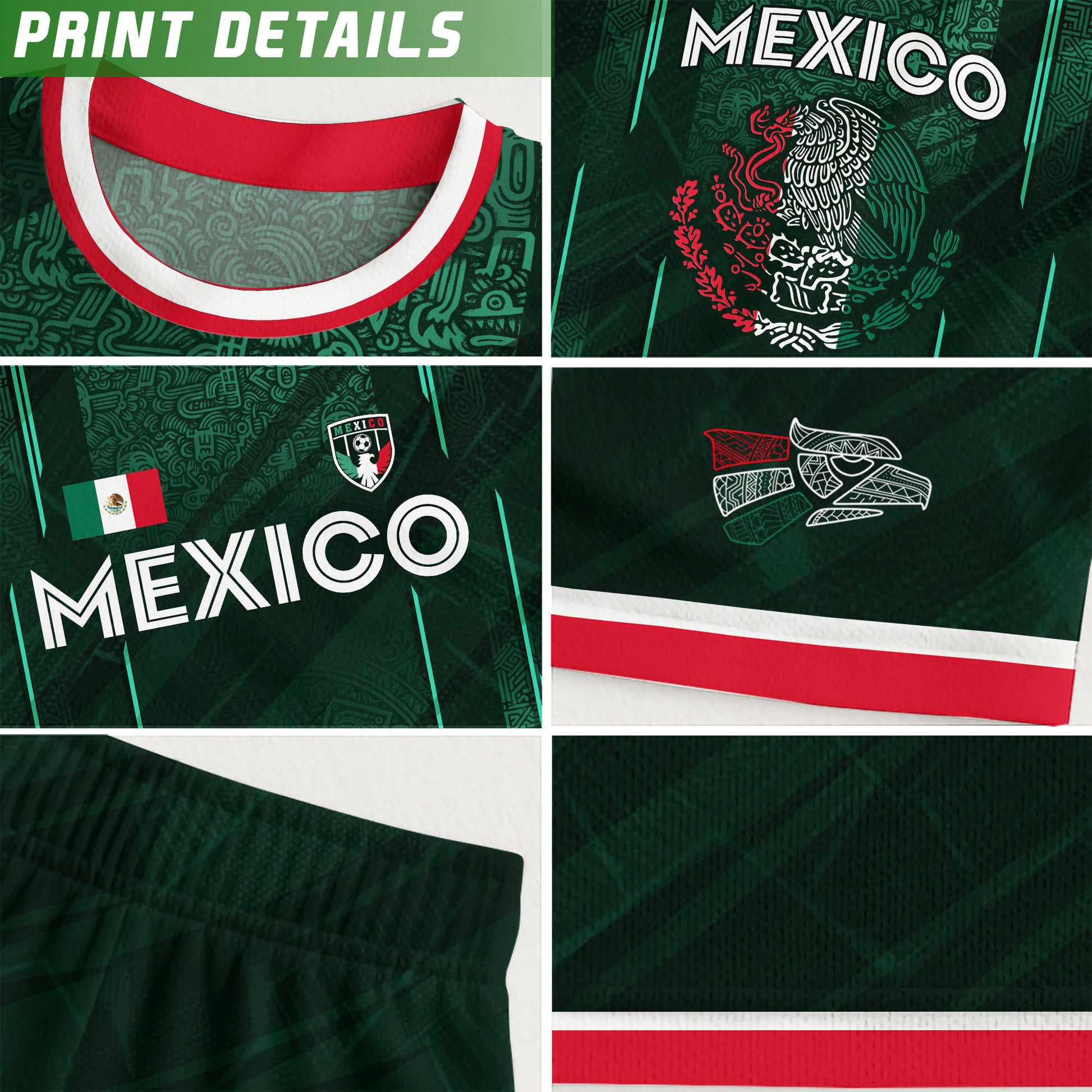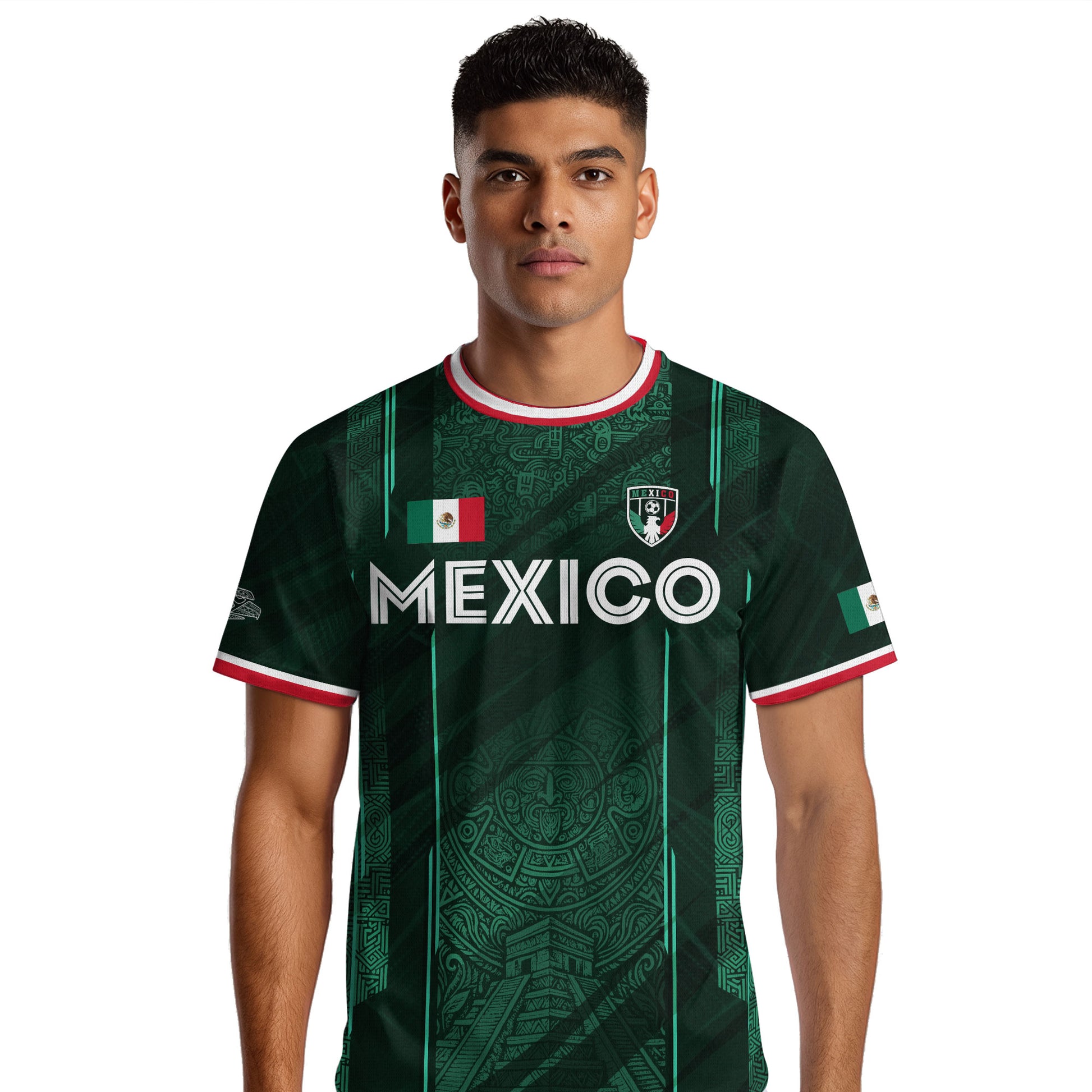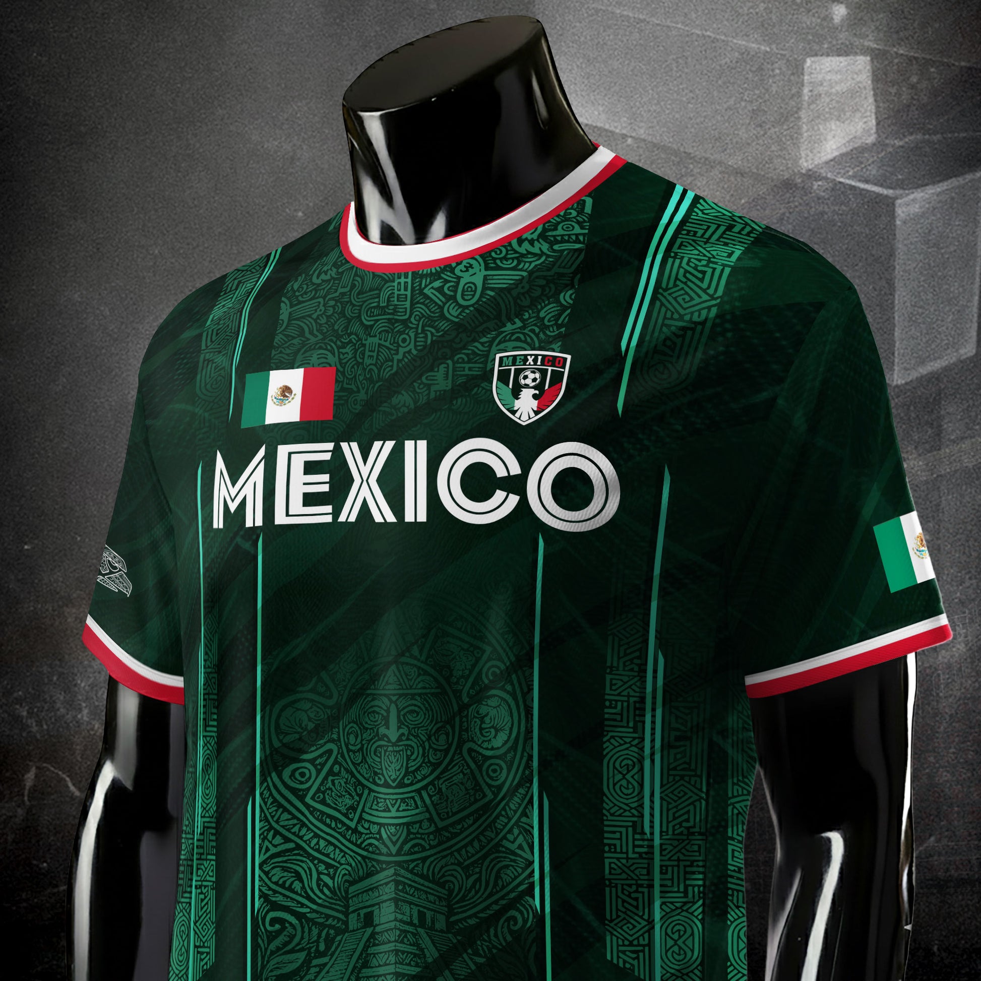 Mexico soccer jersey featuring green Aztec calendar patterns with national emblem. Breathable athletic fabric for comfort and performance.