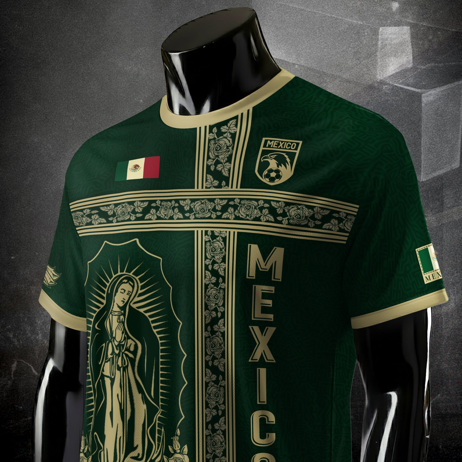 Mexico Soccer Jersey Green Gold Guadalupe Cross Design