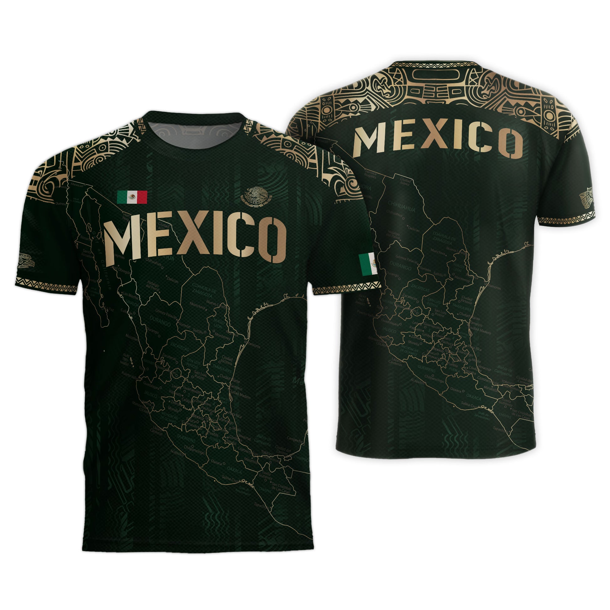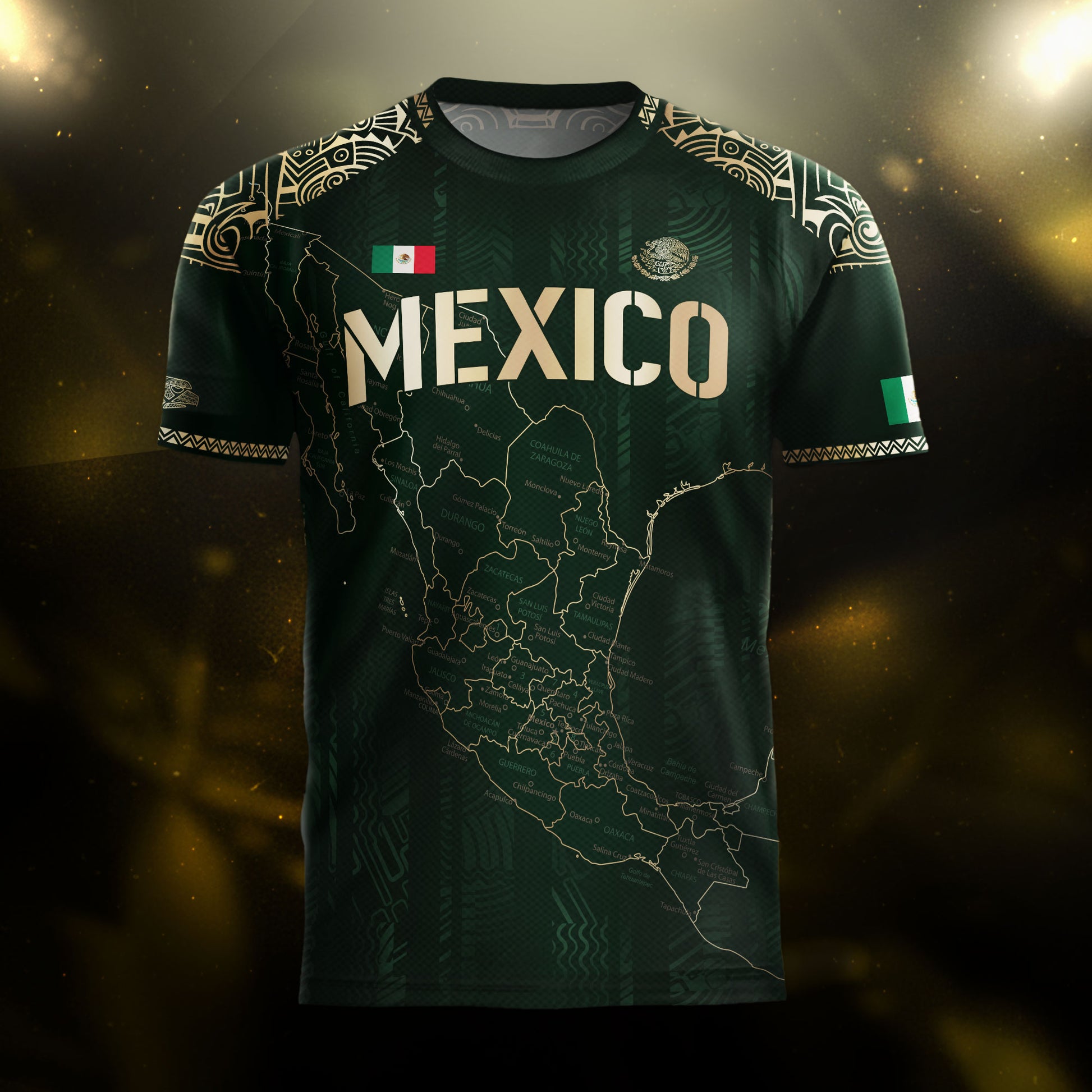 Celebrate Mexico’s heritage with this green soccer jersey featuring a detailed map design and golden Aztec-inspired accents. A bold tribute to culture and football passion.
