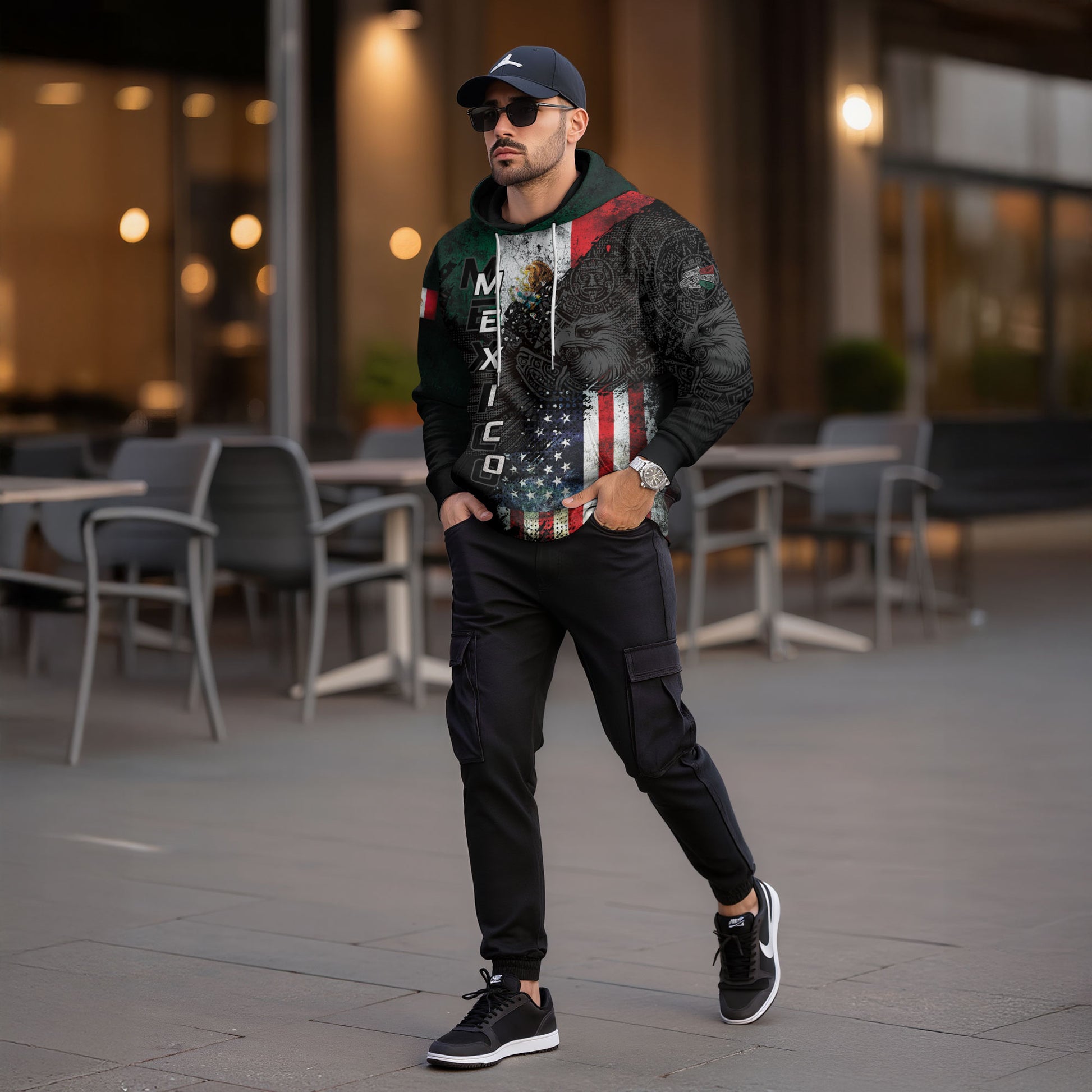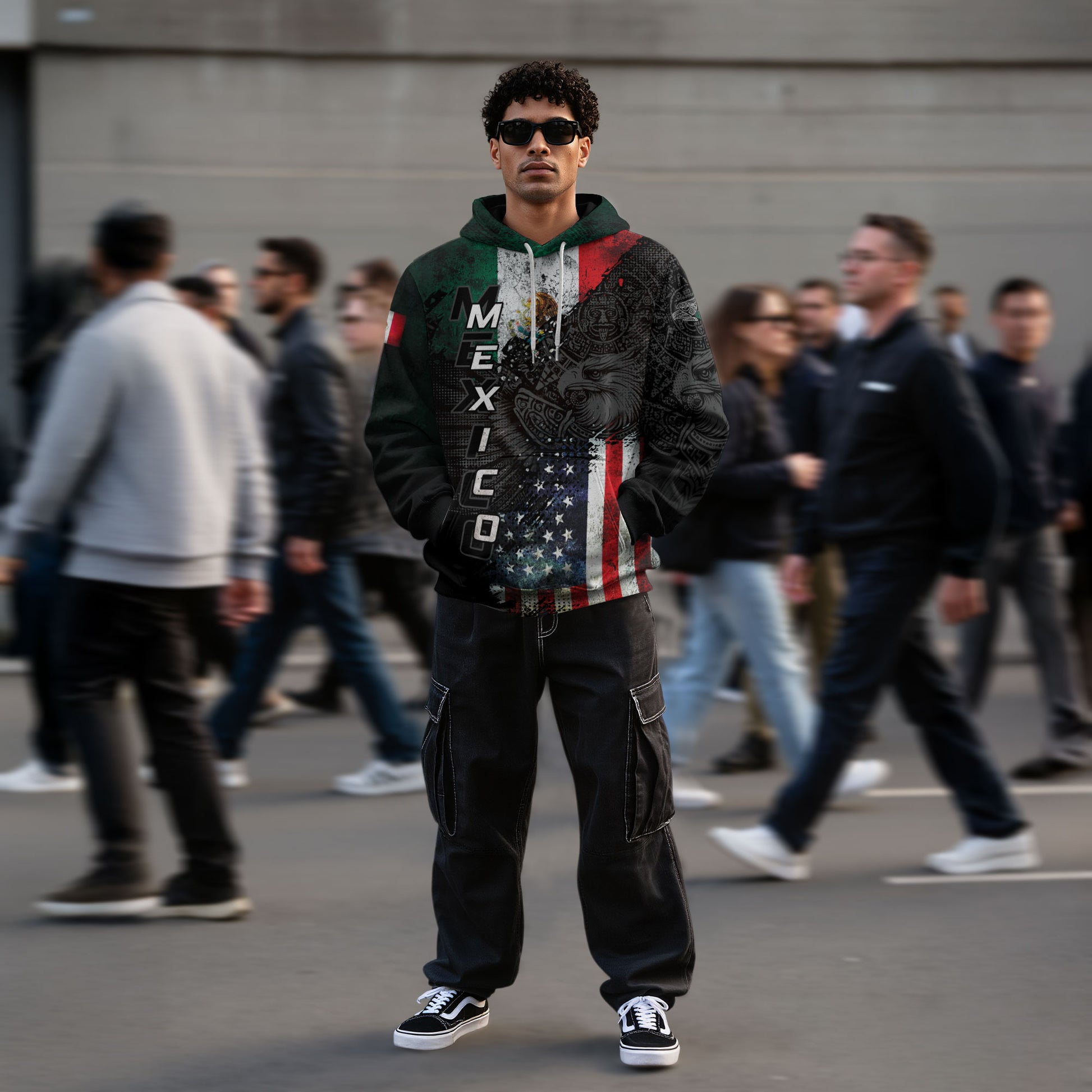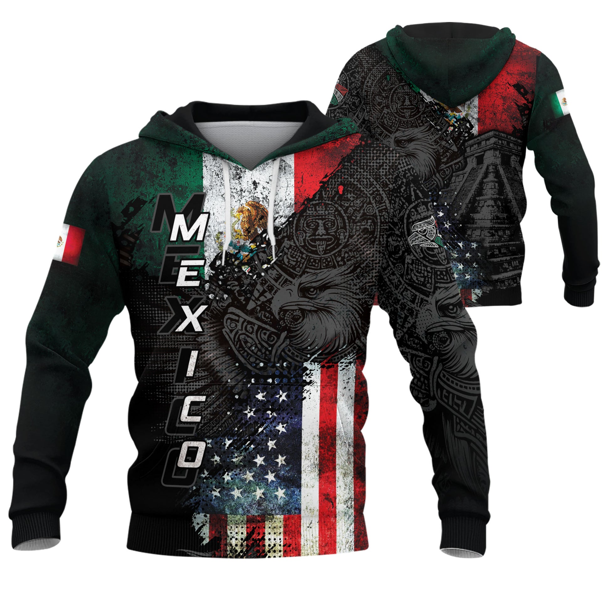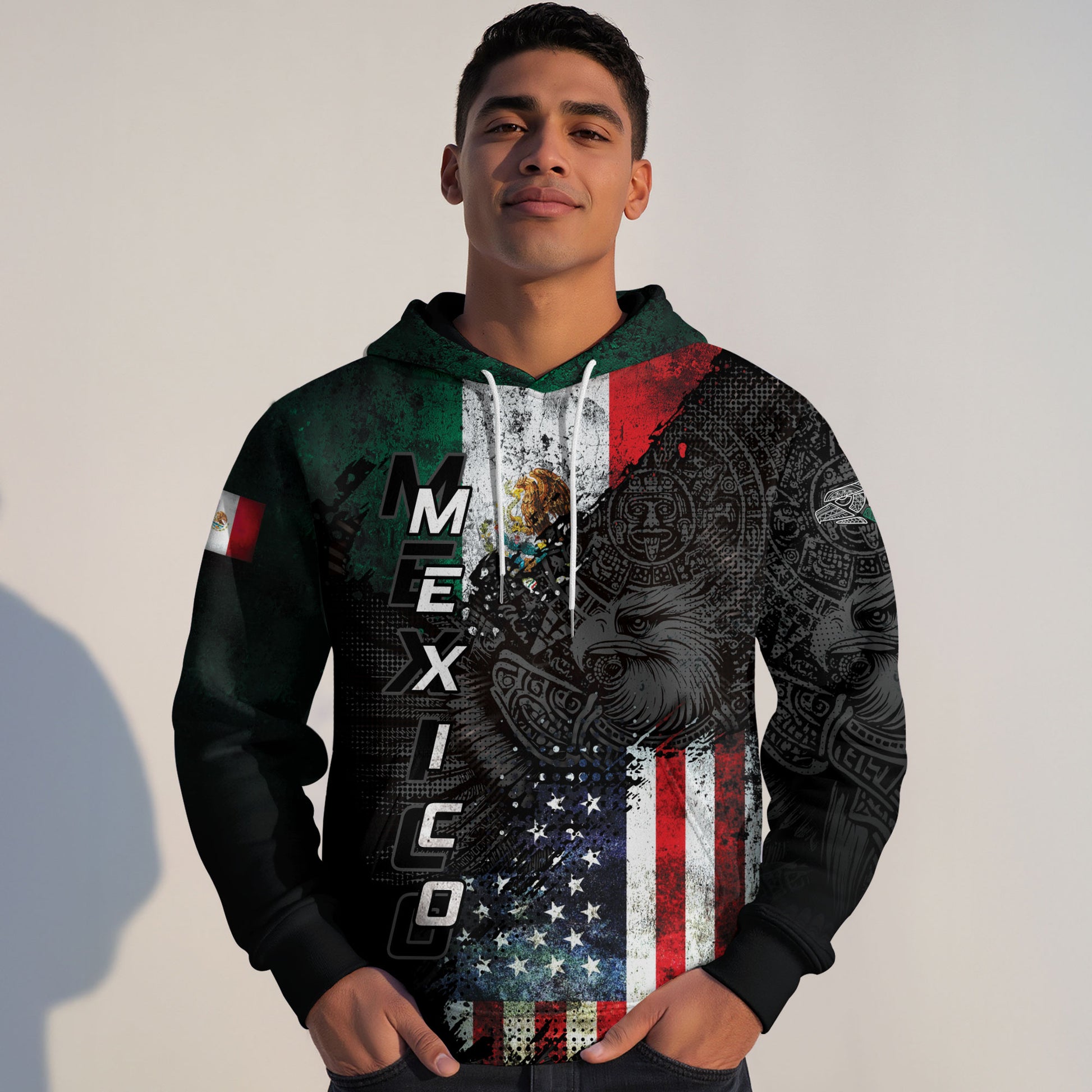 Hoodie blending the flags of Mexico and the USA with Aztec artistry and an eagle motif — a bold tribute to heritage, pride, and unity.