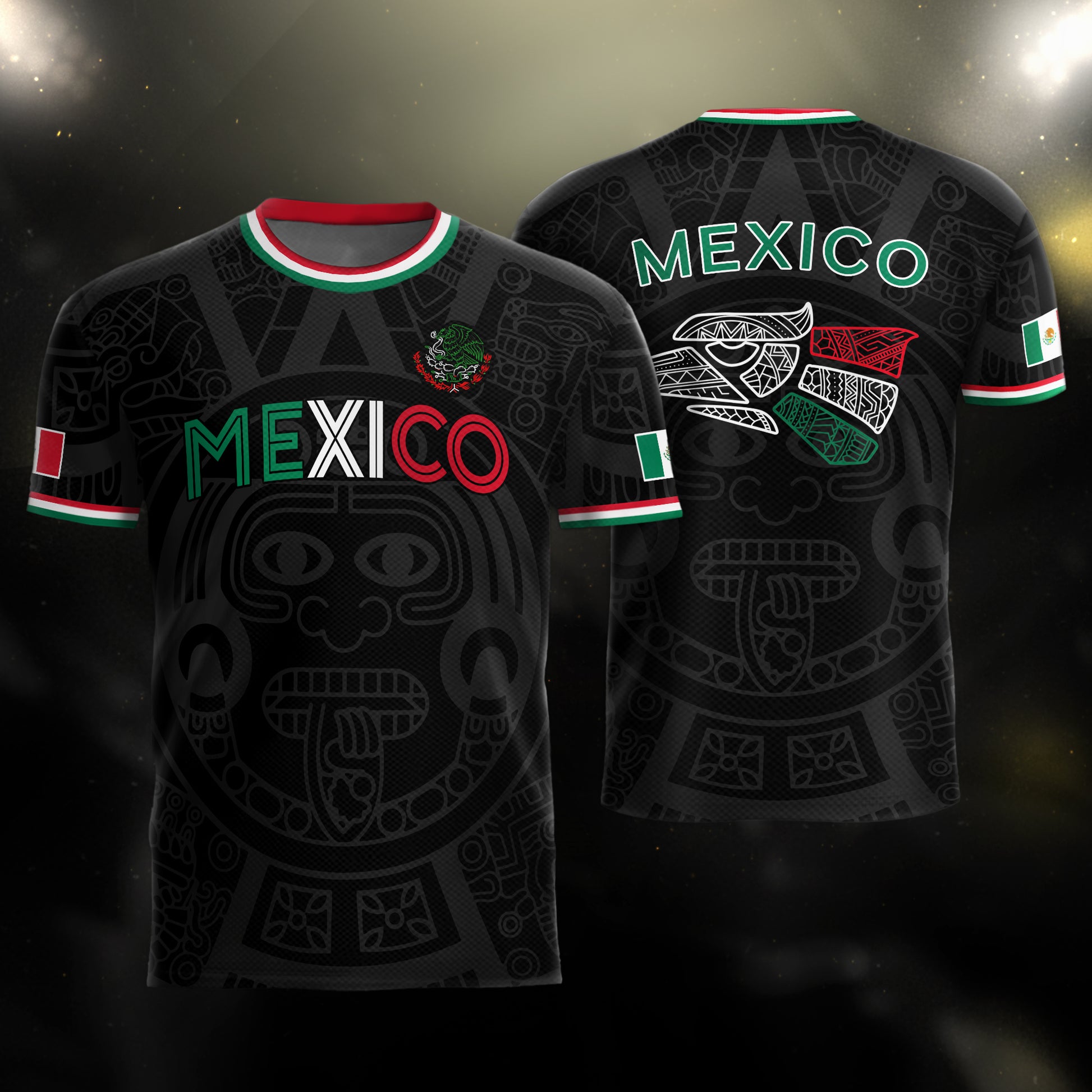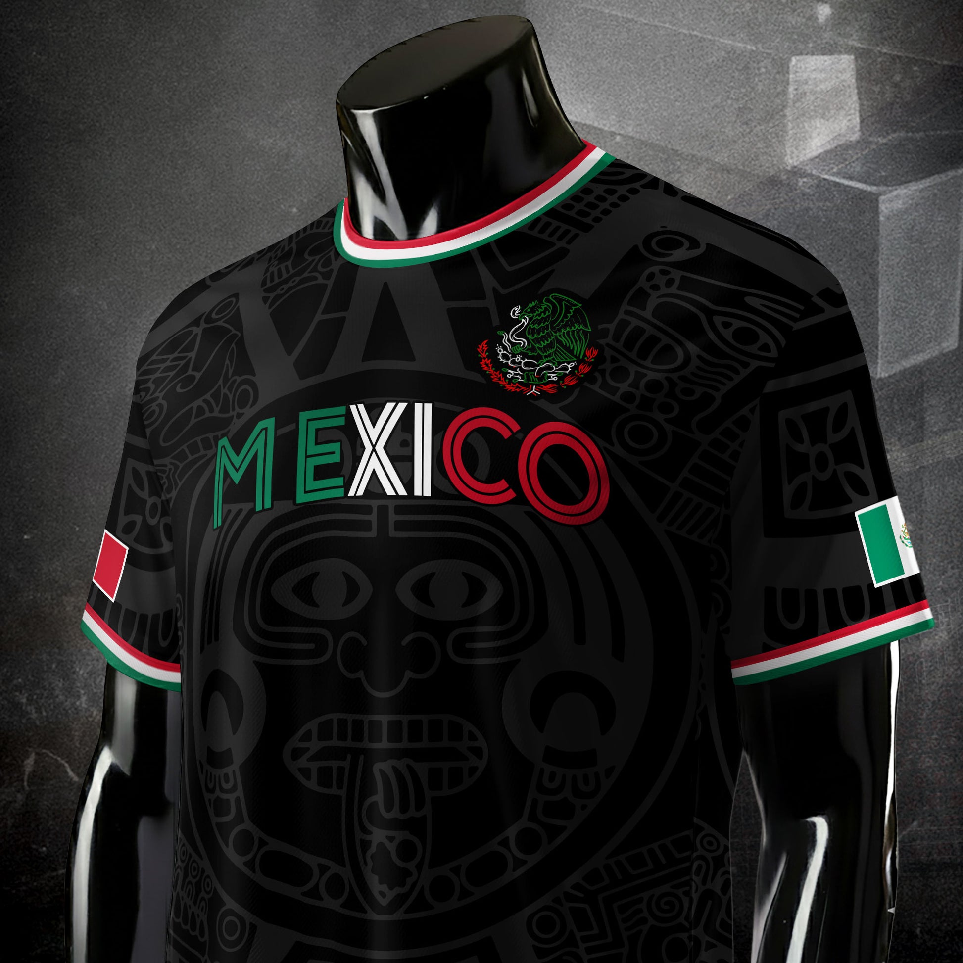 Celebrate Mexican pride with this black soccer jersey featuring Aztec-inspired graphics and tricolor accents. Bold, stylish, and made for passionate fans.