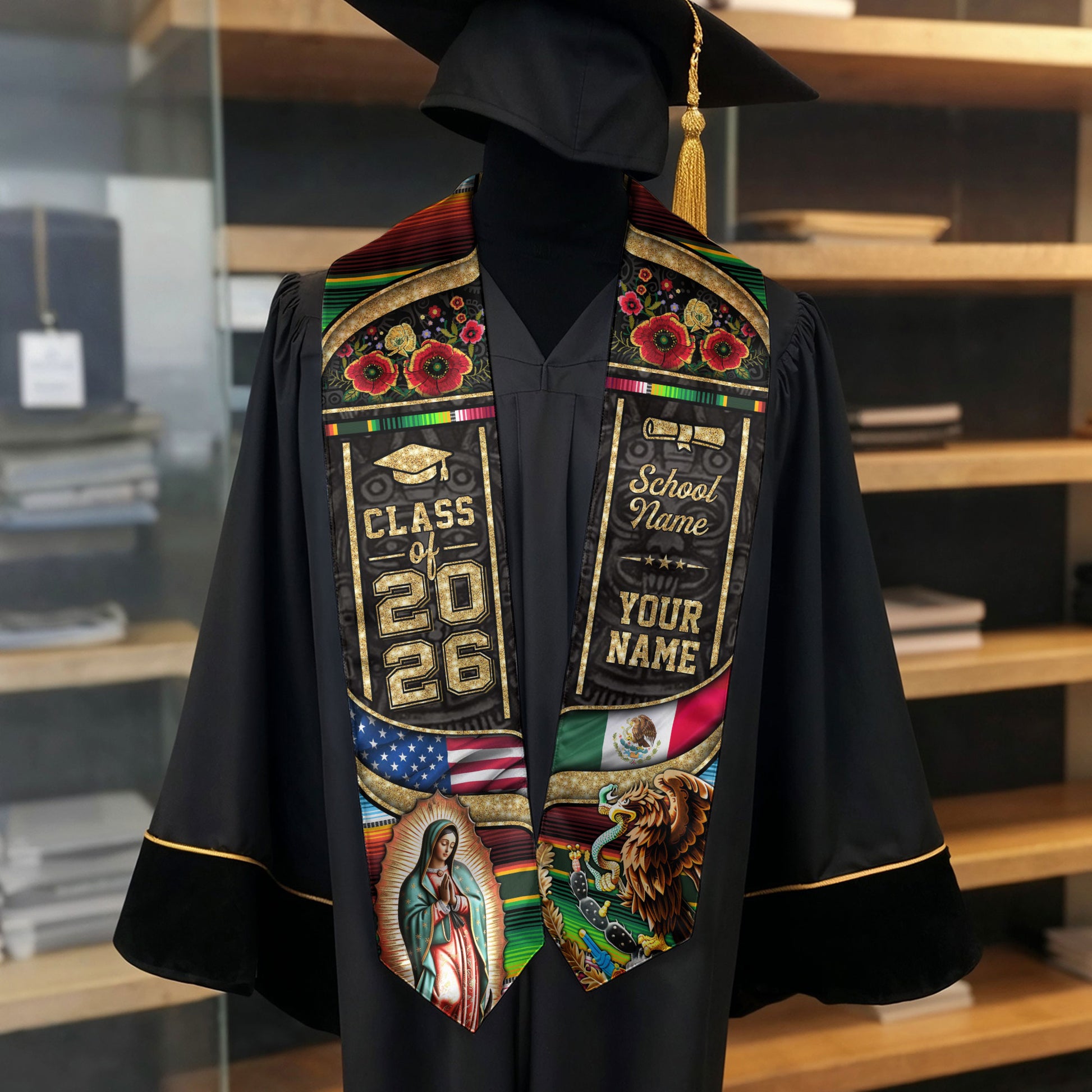 Virgen de Guadalupe 2026 Graduation Stole – Personalized USA & Mexico Heritage Senior Sash with Eagle & Serape Design
