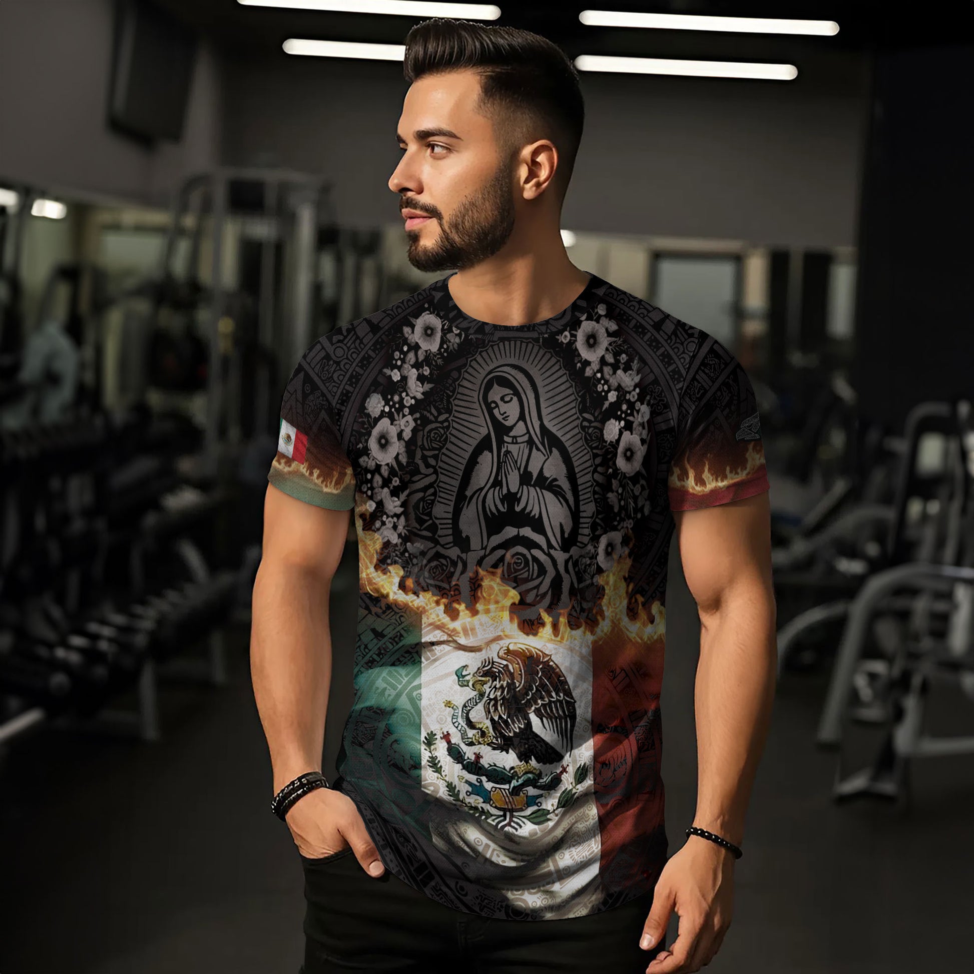 Powerful design featuring the Virgin of Guadalupe with Mexico’s flag in flames — a tribute to faith, pride, and heritage.