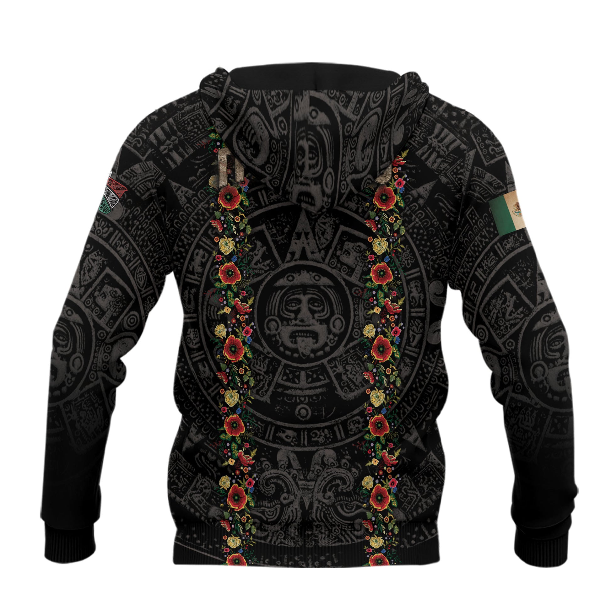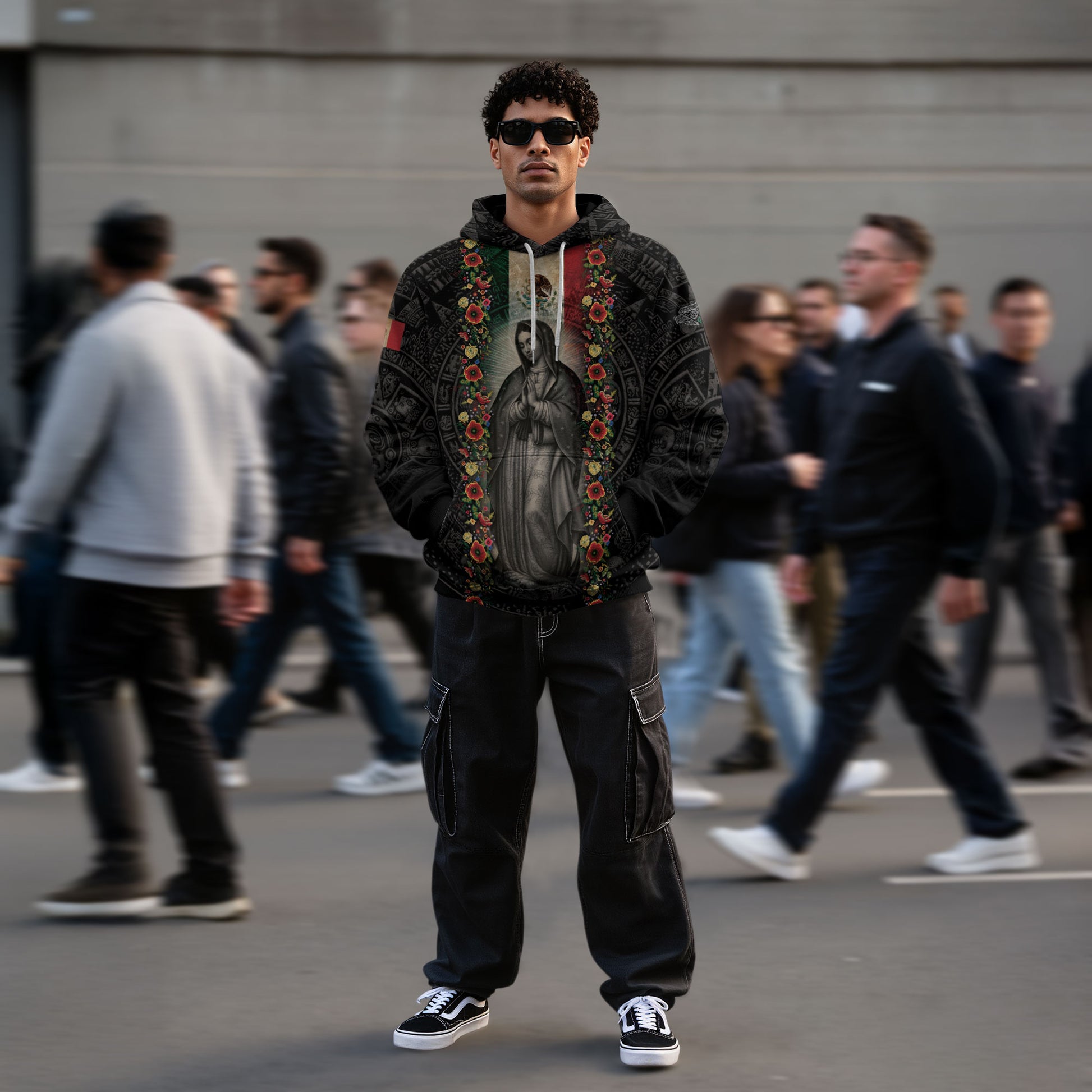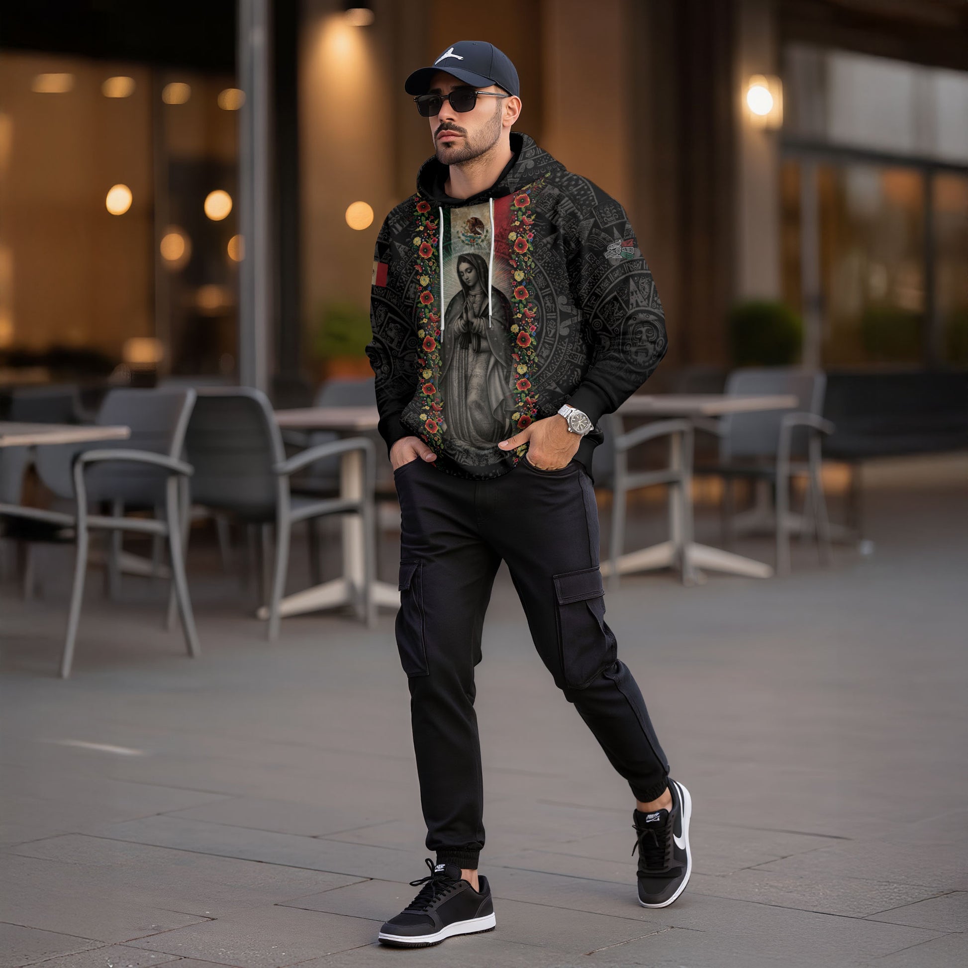 Hoodie featuring the Virgin of Guadalupe framed by Aztec art and the Mexican flag — a sacred symbol of faith, heritage, and devotion.